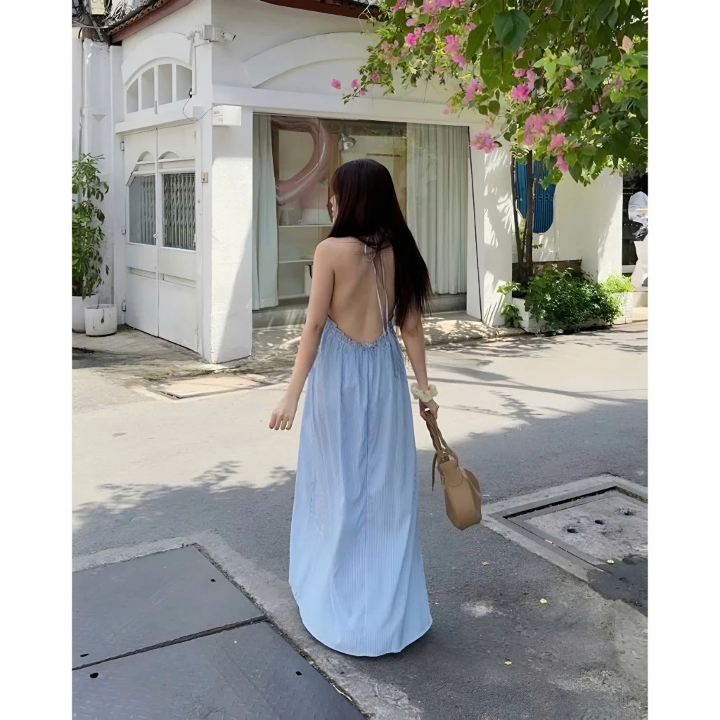 Đầm maxi cổ yếm dáng dài dịu dàng, hơi sexy xíu, nhưng rất hút mắt! Thiết kế kẻ sọc freesize có thể mặc cho nhiều trường hợp, tuy nhiên hãy chọn màu xanh nếu bạn muốn đi du lịch biển.